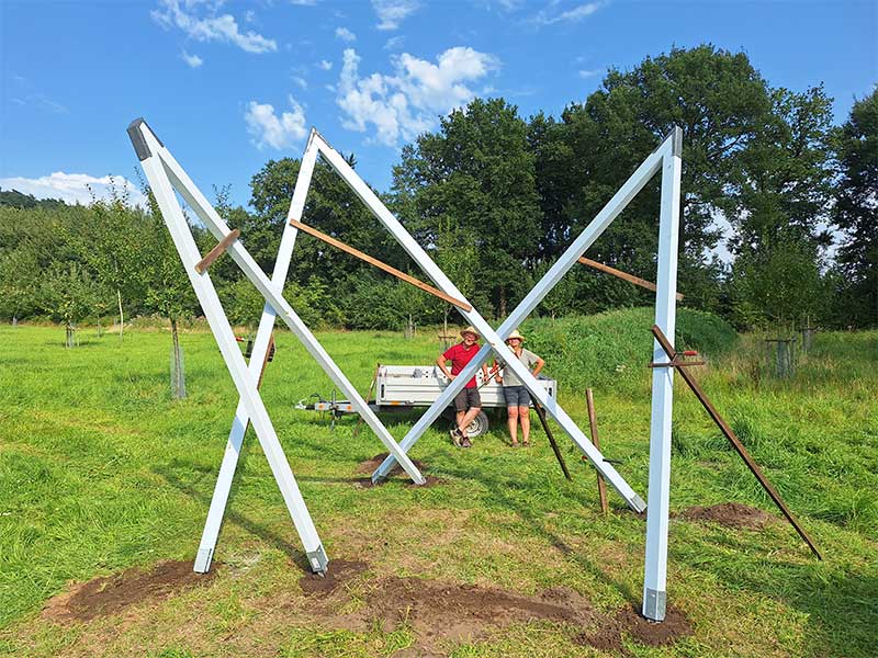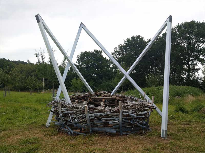 Bereits am Vortag war eine Konstruktion aus hellen Balken installiert worden, als Rahmen, der nun das „Nest in der Natur“ aufnehmen sollte. Dazu galt es zunächst, dessen Umfang mit Kreidestaub auf dem Boden zu markieren. Für den Nestbau selbst lagen schon eine Menge hölzerne Materialien bereit.