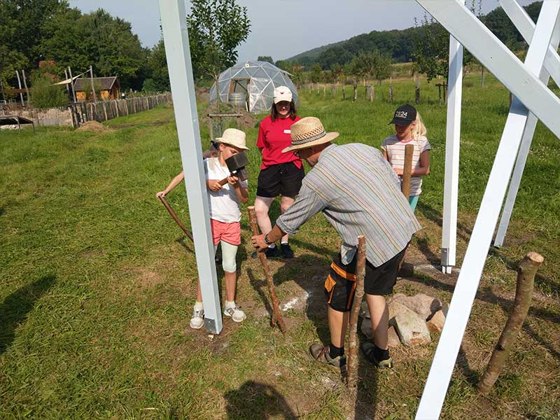 Dann ging es richtig ans Werk: Zuerst mussten Pfähle hergestellt werden, die in den Boden geschlagen werden sollten, damit sie später dem Nest Stabilität geben. Die vorhandenen Rohlinge aus dickeren Ästen wurden mit dem Beil angespitzt und wo nötig noch mit der Säge auf die passende Länge gebracht. Dann kam mit Feingefühl der Hammer ins Spiel und schon bald stand die ovale Doppelreihe aus Holzpfählen. Der Zwischenraum wurde anschließend mit kleineren Ästen und Strauchwerk gefüllt.