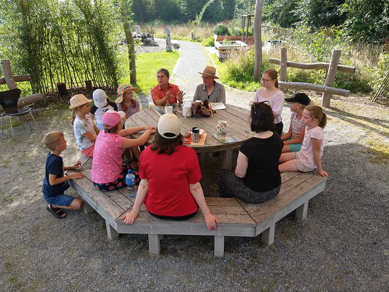 Am 14. August 2025 fand im Lehrgarten am Hof Lammers in Riesenbeck der dritte Workshop in der Veranstaltungsreihe zu „Mensch-Natur-Verhältnissen“ statt. Die Reihe ist als Kooperation zwischen dem DA, Kunsthaus Kloster Gravenhorst und der Gruppe WiesenWunder des Heimatvereins Riesenbeck angelegt worden und begleitete im Juli und August die Sommerausstellung „BIOPHILIA – Von Pflanzen und Menschen“ des DA. Im dritten Termin waren Kinder von 8 bis 12 Jahren die Zielgruppe, die ein Kunstobjekt aus Naturmaterialien gestalten sollten. Sieben junge Kreative hatten sich um zehn Uhr unter dem Sonnensegel im Lehrgarten eingefunden.
